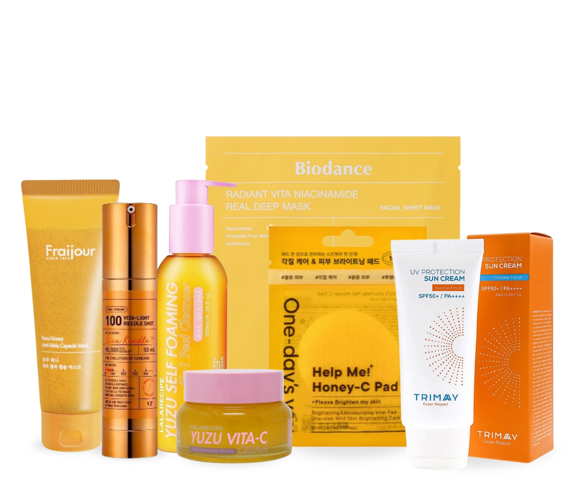 1. Lalarecipe Yuzu Self Foaming 3in1 Peel Cleanser 2. TRIMAY UV Protection Sun Cream, 50ml 3. Fraijour Yuzu Honey Anti-Mela Capsule Mask 4. VT Cosmetics Vita-Lite Riddle Shot 100 5. Lalarecipe Yuzu Vita C Cream 6. Biodance Radiant Vita Niacinamide Real Deep Mask, 1pc 7. One-day's you Handy Help Me Honey-C Pad (10pcs) |
